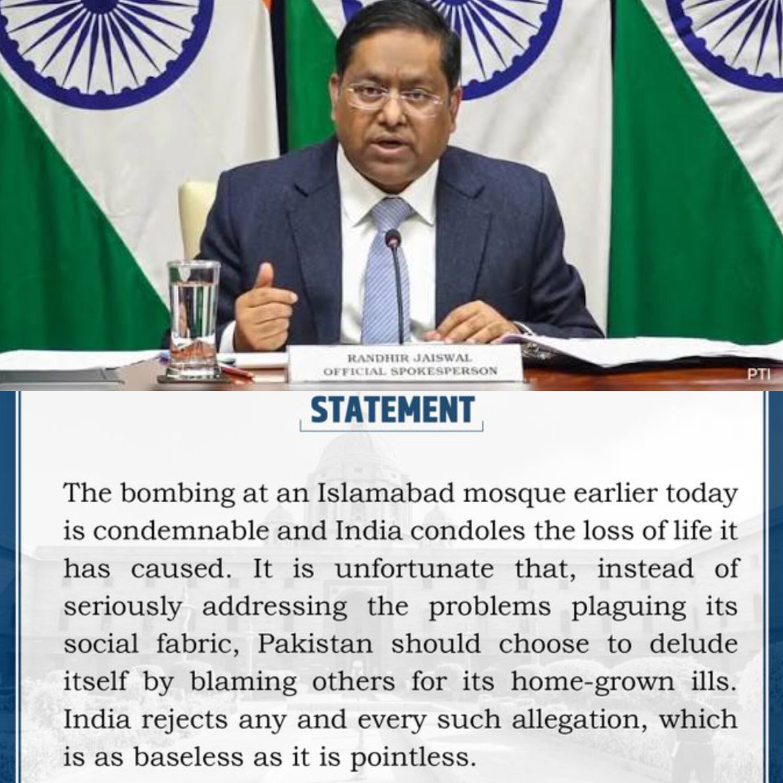 India strongly condemned a deadly suicide bombing at a mosque in Islamabad, which killed dozens of worshippers during Friday prayers, and offered condolences to the victims and their families. In a statement, the Indian Ministry of External Affairs called the attack “condemnable” and categorically rejected Pakistan’s allegations of Indian involvement, describing such claims as “baseless and pointless.” New Delhi criticised Islamabad for blaming external actors instead of tackling its internal security challenges and societal issues. India maintained that Pakistan should focus on addressing its own domestic problems rather than deflecting responsibility. (PC: X)