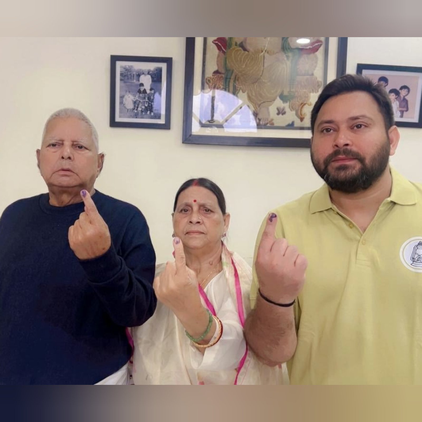 The Yadav family cast their votes in Patna during the first phase of the Bihar Assembly elections on Thursday. Former chief ministers Lalu Prasad Yadav and Rabri Devi were joined by their son and RJD leader Tejashwi Yadav, daughter Misa Bharti, and other family members. They posed for cameras after voting, but Tej Pratap Yadav, who is contesting from Mahua on his own party’s ticket, was not present. The first phase covers 121 of Bihar’s 243 seats, with a triangular contest between the NDA, Mahagathbandhan, and Prashant Kishor’s Jan Suraaj Party. (PC: HT)