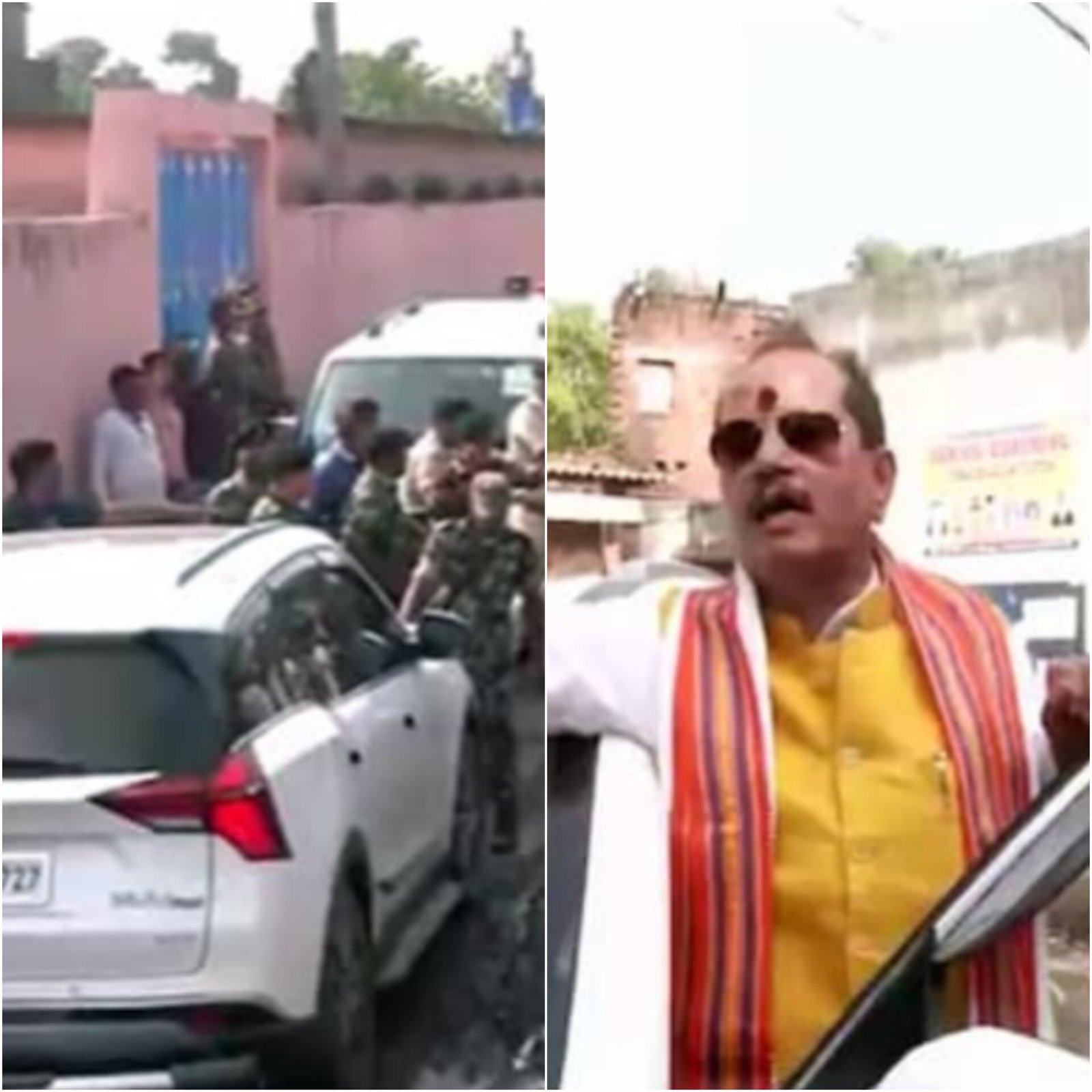 Bihar Deputy Chief Minister Vijay Kumar Sinha’s convoy was attacked in Lakhisarai on polling day. Unidentified people threw stones, cow dung, and slippers at his car. The BJP blamed RJD supporters for the attack. Sinha said the attackers tried to stop him from visiting Khoriari village and accused the local police of being weak. He demanded deployment of central forces and said he would protest in the village. Police called it a protest by locals and said the situation was under control. The Election Commission has asked the Bihar DGP to take strict action against those involved. (PC: ANI)