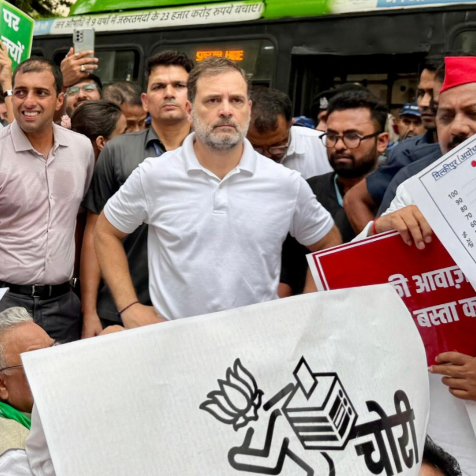 Rahul Gandhi’s ‘Vote Chori’ campaign has become a rallying point for the Opposition, with INDIA bloc leaders joining him in a protest march in Parliament against the upcoming cross-country SIR. The BJP dismissed the move as a “predictable playbook,” accusing Gandhi of undermining public trust in institutions rather than seeking judicial proof. Party sources criticized his failure to address internal weaknesses, including poor organization and waning cadre strength. The march marked the first major show of unity among Opposition parties since the Lok Sabha elections, with leaders from SP, DMK, TMC, RJD, and Left standing alongside Gandhi. (PC: X)
