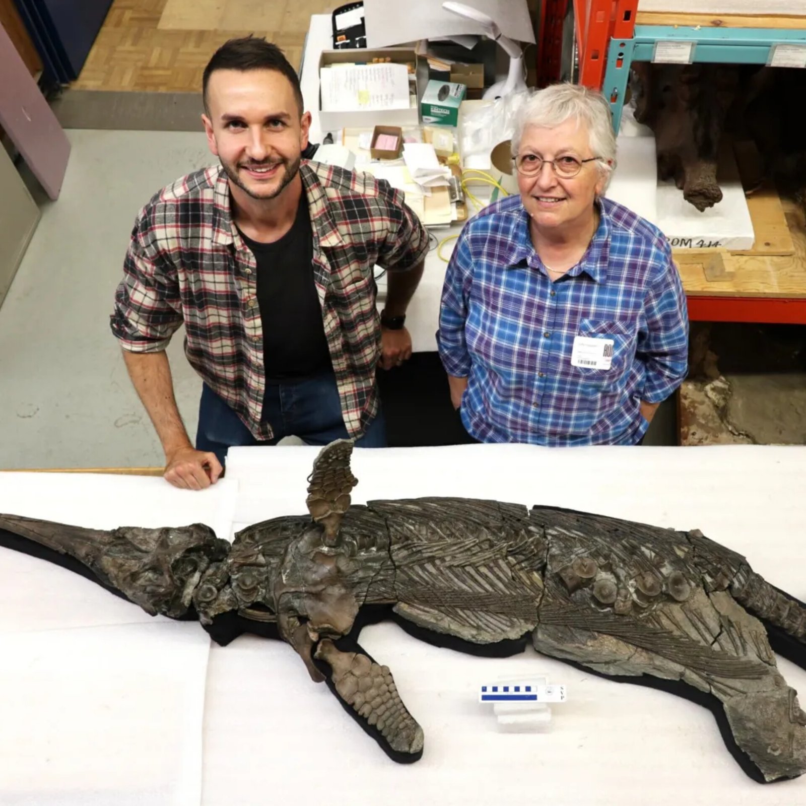 A near-complete 185-million-year-old fossil discovered on Dorset’s Jurassic Coast has been identified as a new ichthyosaur species, Xiphodracon goldencapensis — meaning “sword dragon of Dorset.” Measuring about 3 meters, the marine reptile had a long sword-like snout and enormous eye sockets. Ichthyosaur experts Dr. Dean Lomax and Prof. Judy Massare confirmed the find, calling it a missing link in ichthyosaur evolution. Fossil hunter Chris Moore discovered it at Golden Cap in 2001. Scientists say marks on the skull suggest the creature was killed by a larger ichthyosaur. The specimen is housed at the Royal Ontario Museum in Canada. (PC: BBC)