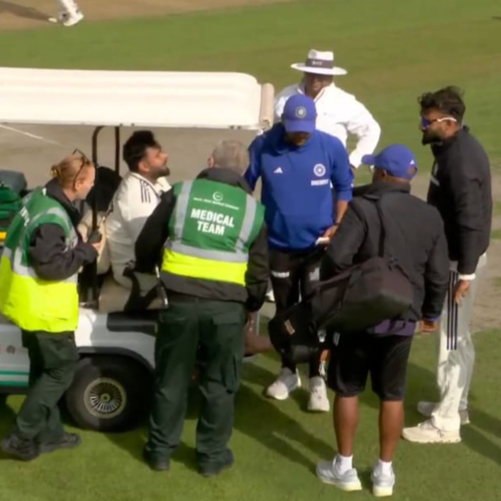 India's Rishabh Pant was taken to a hospital in Manchester after a painful injury on Day 1 of the 4th Test against England. A yorker from Chris Woakes struck his right toe, causing bleeding and swelling. Pant, in visible pain, could not stand and was taken off the field in an ambulance. He had scored 37 runs before the injury. The BCCI confirmed scans are underway and the medical team is monitoring him. Head coach Gautam Gambhir and captain Shubman Gill are concerned. If ruled out, it will be a big blow for India, already trailing 1-2 in the series. (PC: PTI)