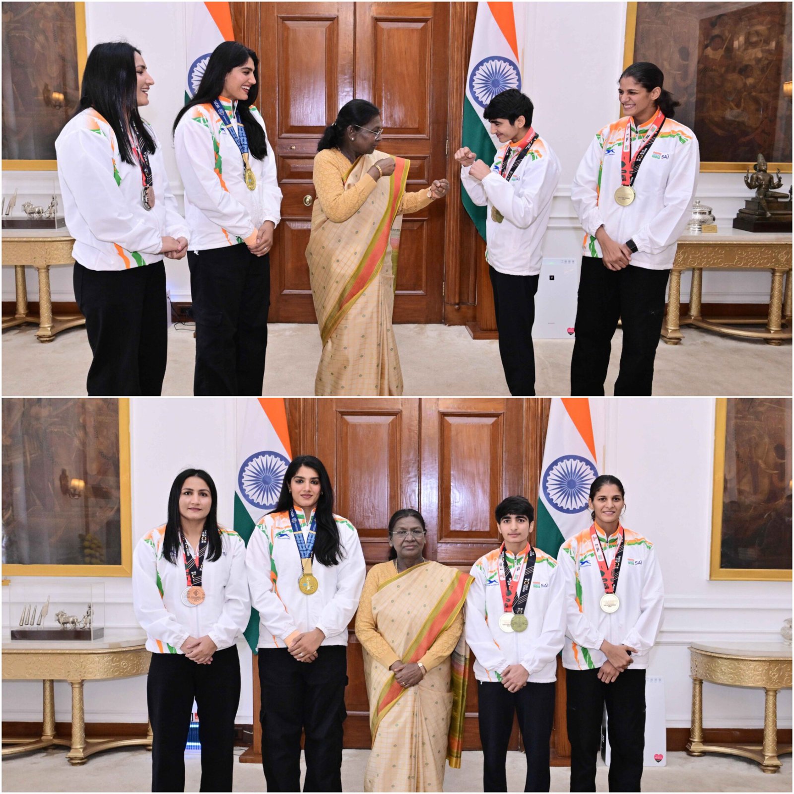 President Droupadi Murmu honoured India’s women boxers on Wednesday after their strong performance at the 2025 World Boxing Championships in Liverpool. She met the medal winners at Rashtrapati Bhavan and praised their “exceptional performances.” Jaismine Lamboria and Minakshi Hooda won gold medals, Nupur Sheoran took silver, and Pooja Rani won bronze. India finished the event with four medals in total. Minakshi defeated Paris 2024 bronze medallist Nazym Kyzaibay to win the 48 kg title. The President said their achievements highlight India’s growing strength in world boxing. Twenty Indian boxers competed, including Olympians Lovlina Borgohain and Nikhat Zareen. (PC: X/@rashtrapatibhvn)
