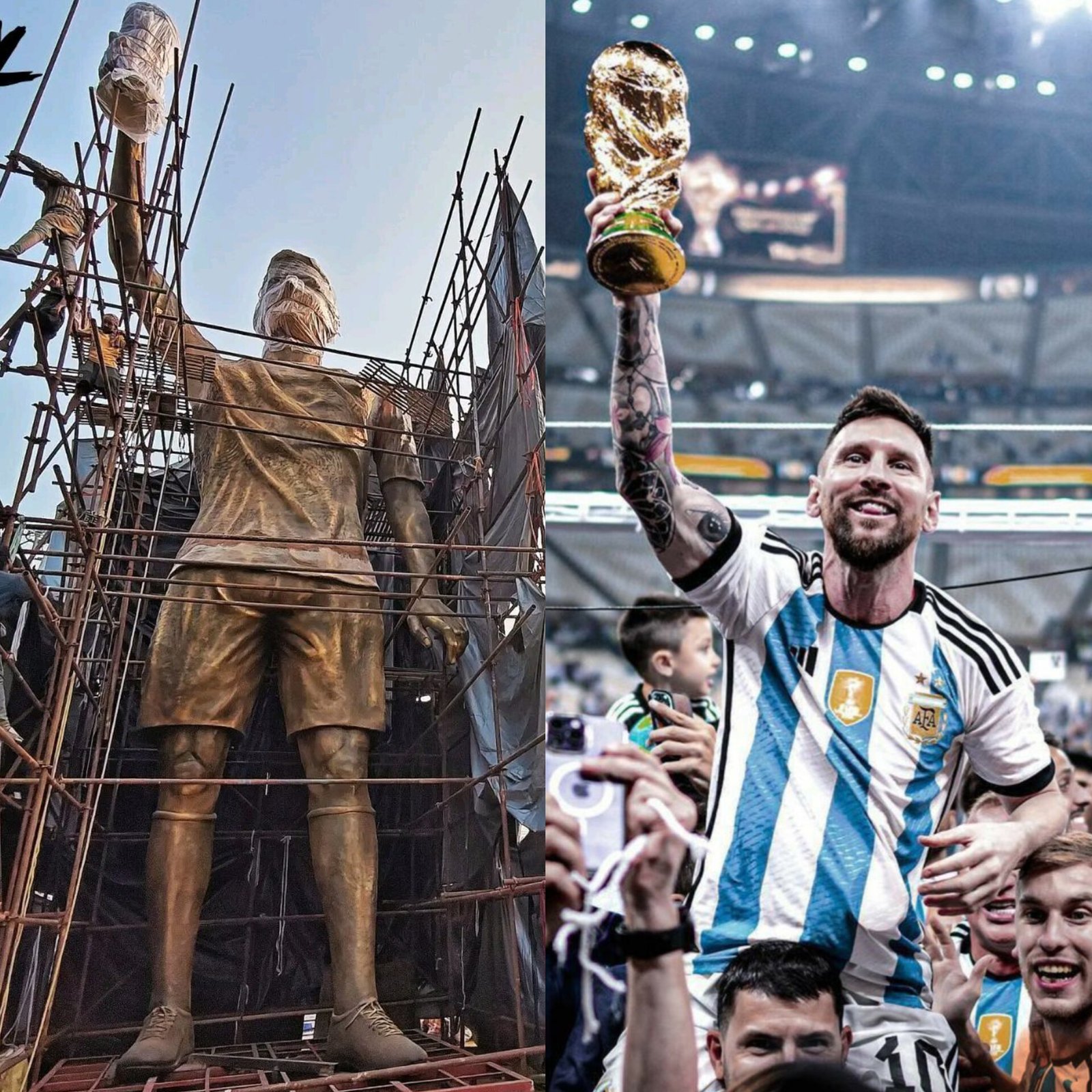 A 70-foot iron statue of football legend Lionel Messi has been unveiled at Lake Town in South Dum Dum, Kolkata, by the Sree Bhumi Sporting Club, with work finishing touches underway. The towering sculpture depicts Messi holding the FIFA World Cup trophy and was completed in just 40 days, club president and West Bengal Minister Sujit Bose said, claiming it’s the biggest Messi statue in the world. Organisers say Messi will virtually inaugurate the statue on December 13 during his India visit, due to security concerns, while fans eagerly await the tribute ahead of the 2026 World Cup. (PC: X)