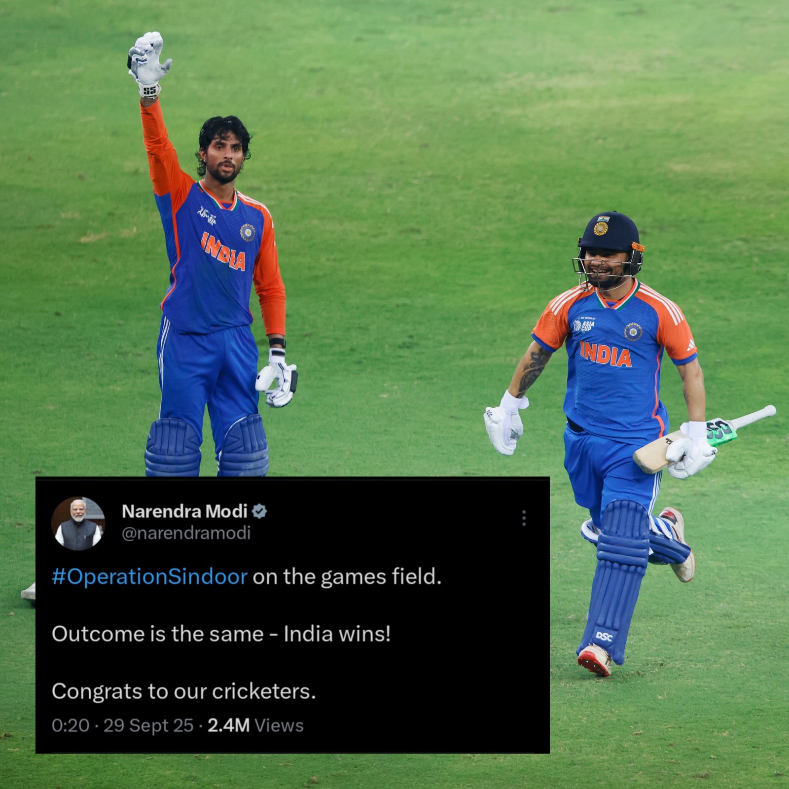 Prime Minister Narendra Modi congratulated Team India on their Asia Cup 2025 victory over Pakistan. Posting on X, he wrote, “#OperationSindoor on the games field. Outcome is the same – India wins! Congrats to our cricketers.” India beat Pakistan by five wickets in a thrilling final, with Tilak Varma scoring an unbeaten 69 to guide the team home. Fans across the country celebrated the win, marking India’s 9th Asia Cup title and a clean sweep against Pakistan in the tournament. Modi’s message highlighted national pride and applauded the team’s skill and determination. (PC: X)