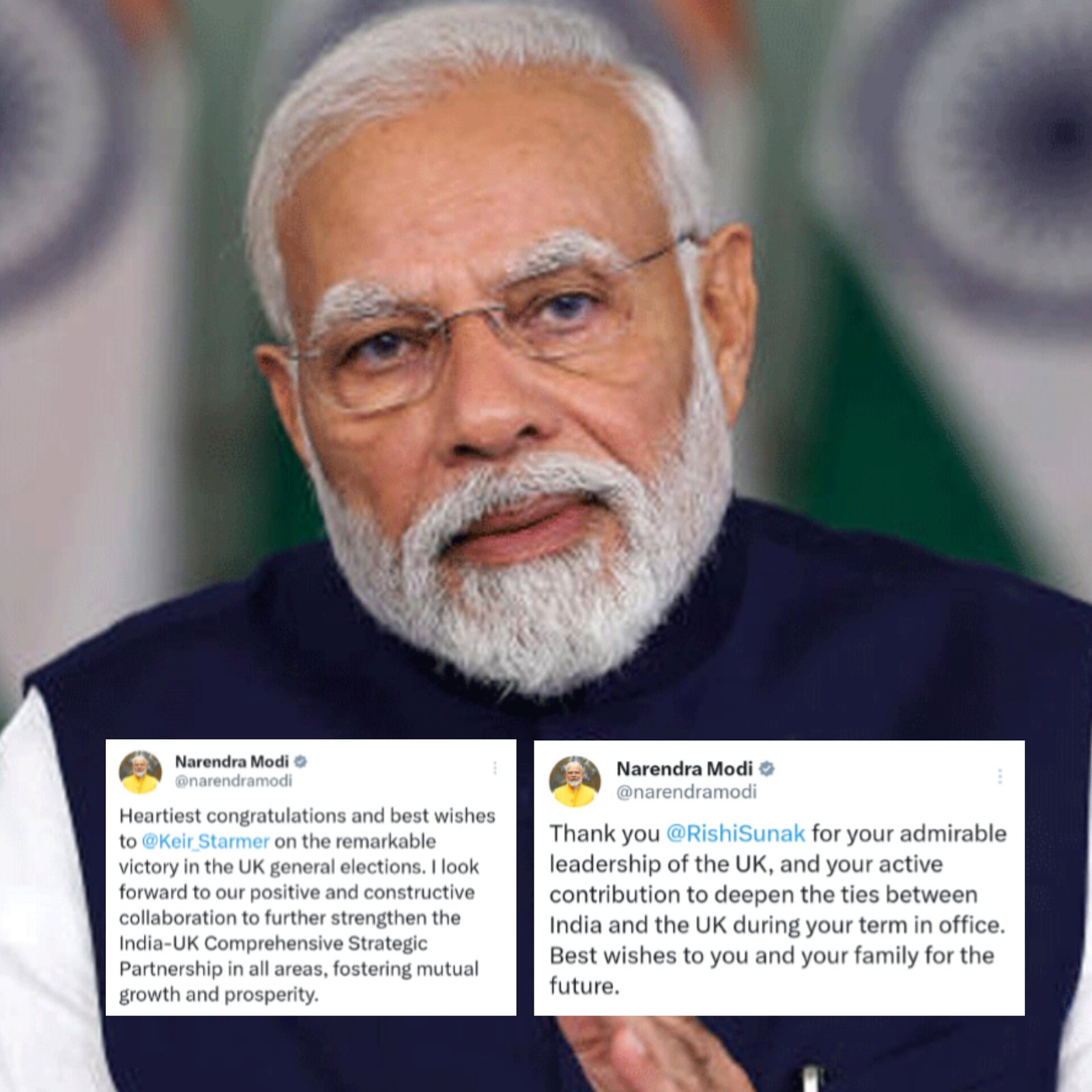 Prime Minister Narendra Modi congratulated Keir Starmer on his Labour Party's historic victory in the UK general elections. He expressed eagerness to strengthen India-UK ties under Starmer's leadership. PM Modi also thanked outgoing Prime Minister Rishi Sunak for his efforts to enhance bilateral relations. Starmer's Labour Party secured 412 seats in the 650-seat House of Commons, ending 14 years of Conservative rule. Modi's tweets highlighted the desire for positive collaboration and mutual growth between the two nations. Sunak, Britain’s first Indian-origin PM, was praised for his leadership and contributions during his term.